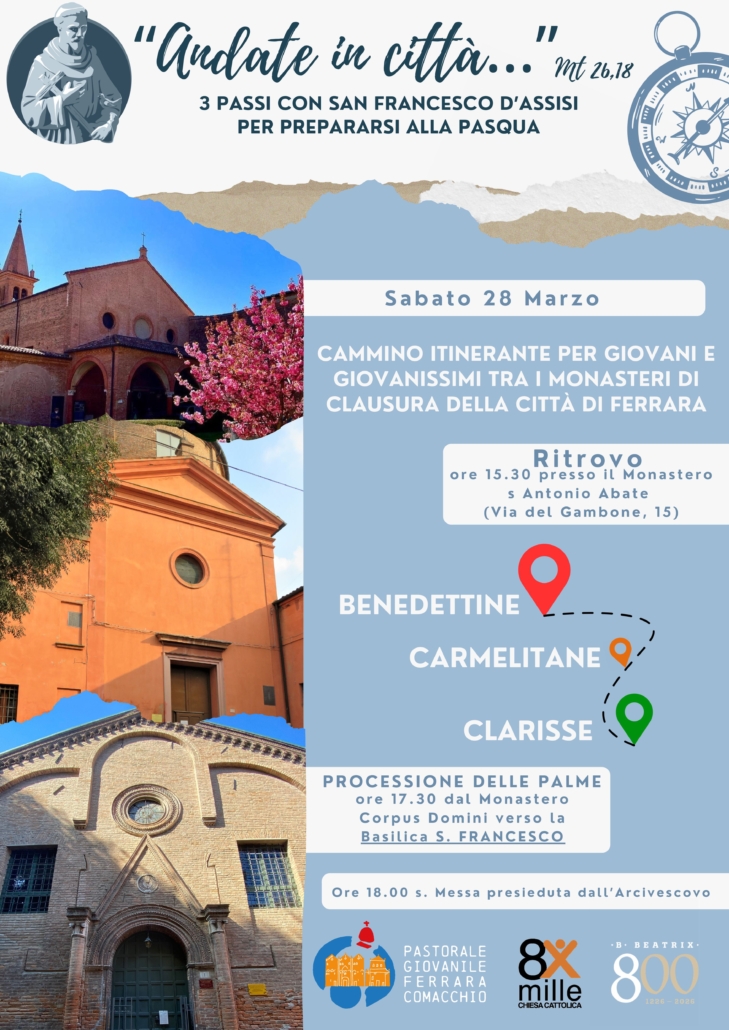 Sabato 28 marzo 2026, vigilia della Domenica delle Palme, la Pastorale Giovanile diocesana assieme alle tre comunità di clausura della città, propone ai giovani e ai giovanissimi un pomeriggio di riflessione, fraternità e preghiera che culminerà nella processione delle palme dal Monastero Corpus Domini fino alla Basilica di san Francesco dove il nostro Arcivescovo Gian Carlo celebrerà la santa Messa solenne.